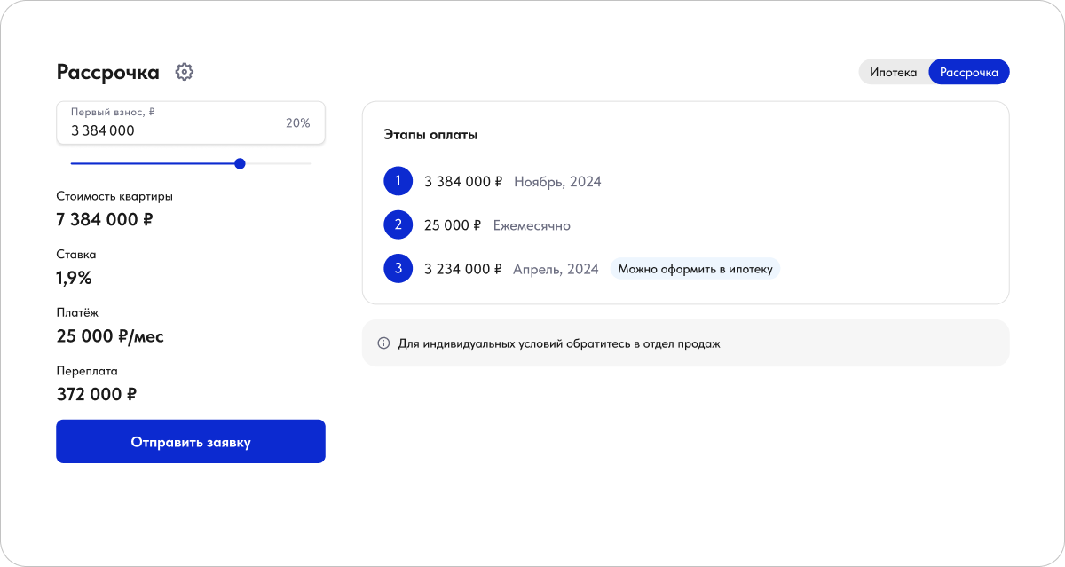 Калькулятор рассрочки внешне похож на ипотечный калькулятор: покупатель также получает понятные и прозрачные условия (удобный расчёт платежей, первоначального взноса и этапов оплаты), а вы — больше лидов, меньше рисков и удобный инструмент для продаж.