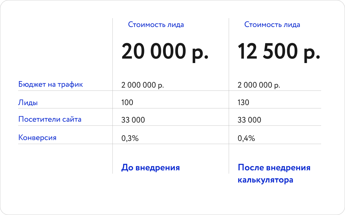Практика показывает, что при сохранении бюджета на рекламу с ипотечным калькулятором на сайте количество целевых лидов увеличивается до 130, а конверсия поднимается до 0,4%.
